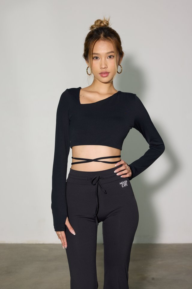 NVTT522- 黑色斜領顯瘦綁帶運動上衣(連胸墊)