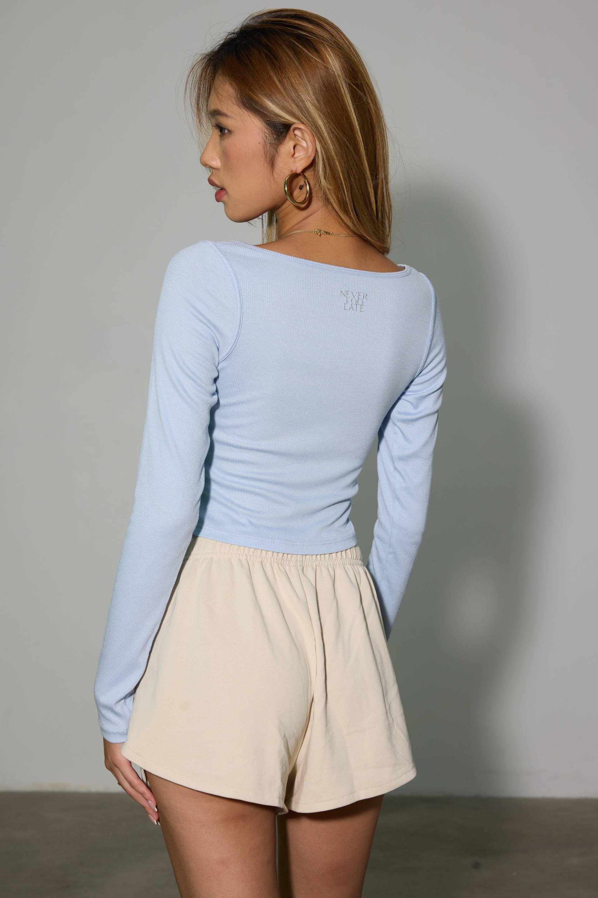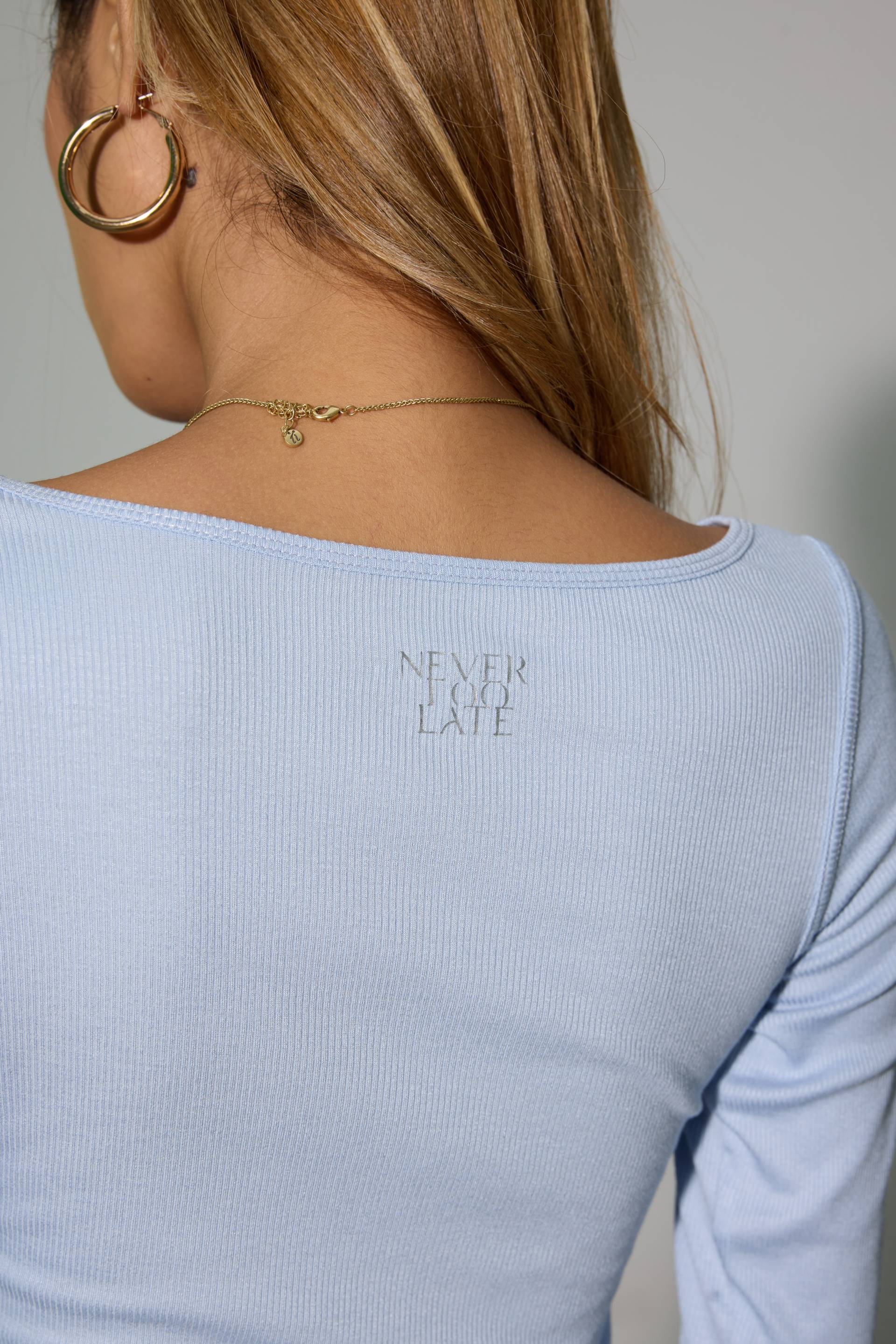 NVTO622- 亞麻藍圓領假扣修身親膚長袖上衣