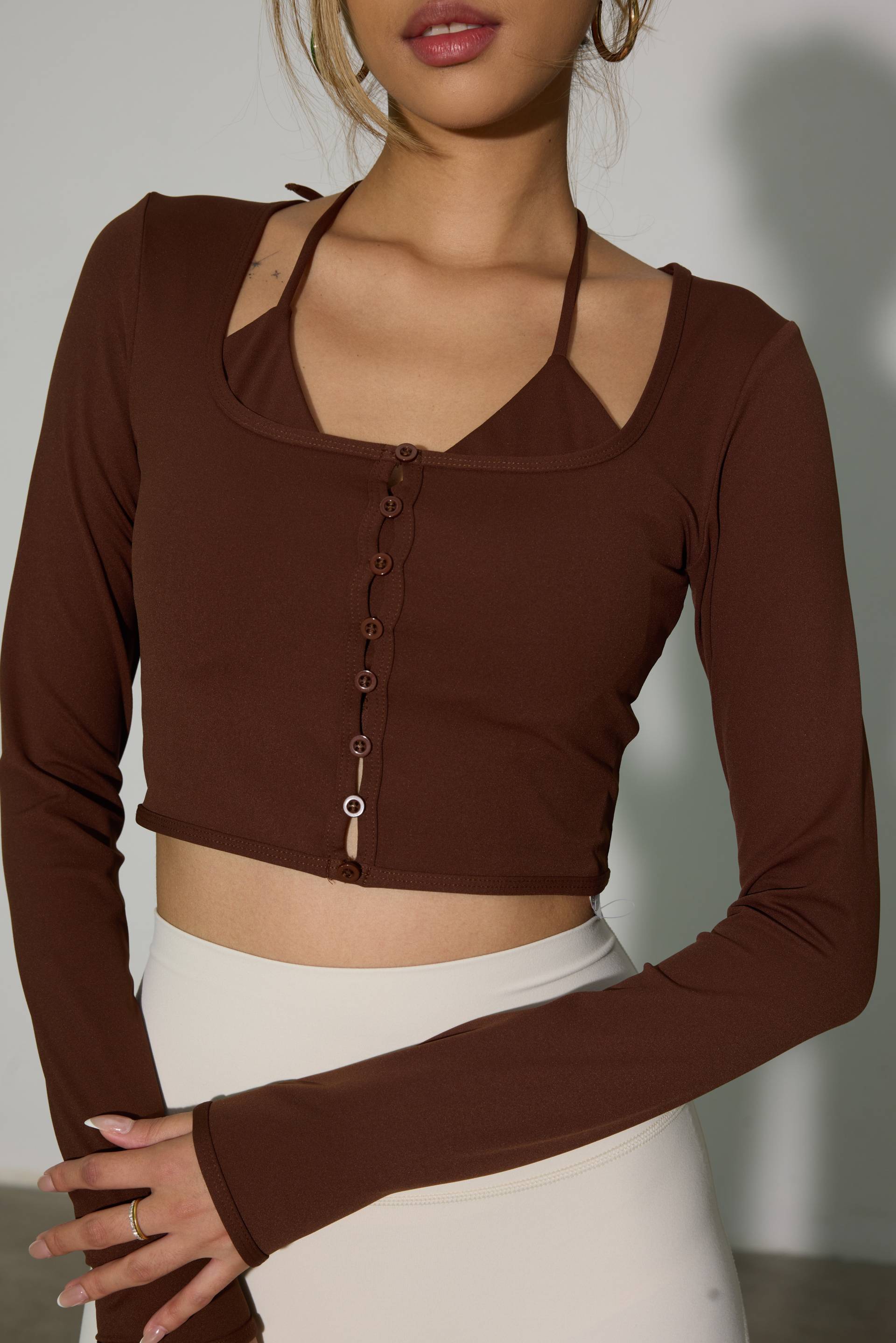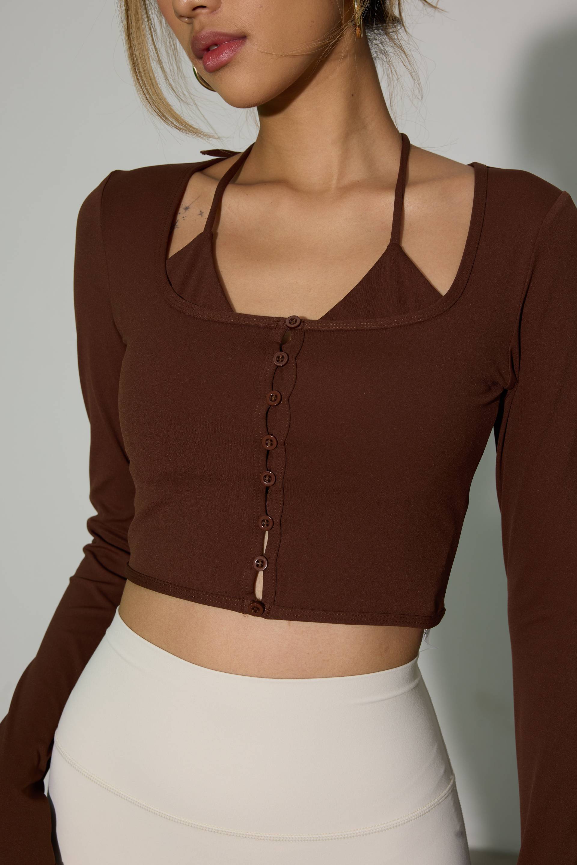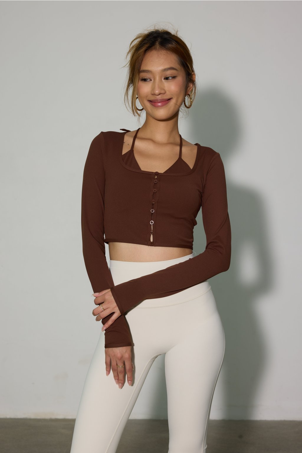 NVTT512- 深咖啡顯瘦貓耳掛頸假兩件運動上衣(連胸墊)