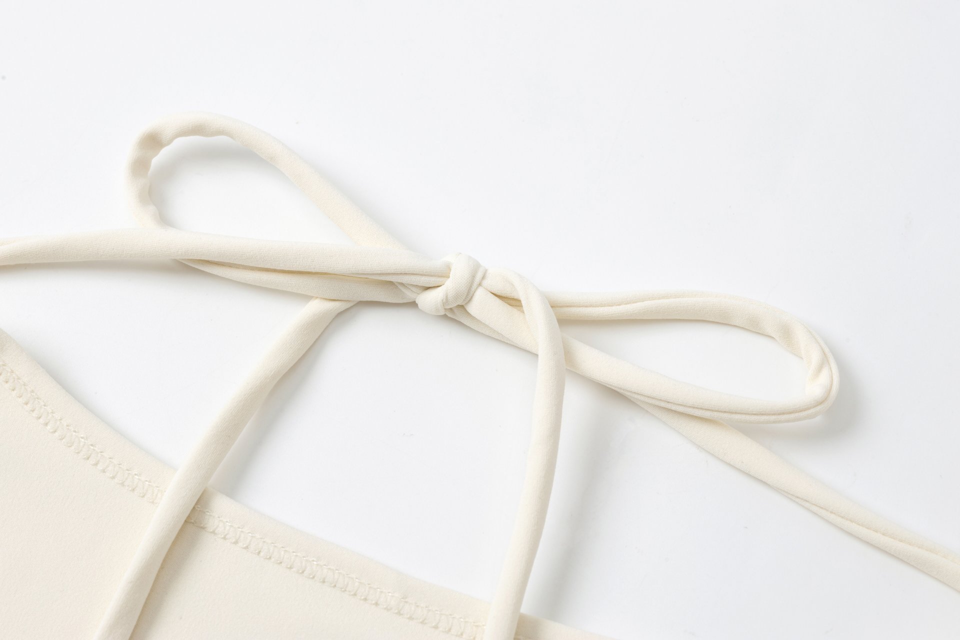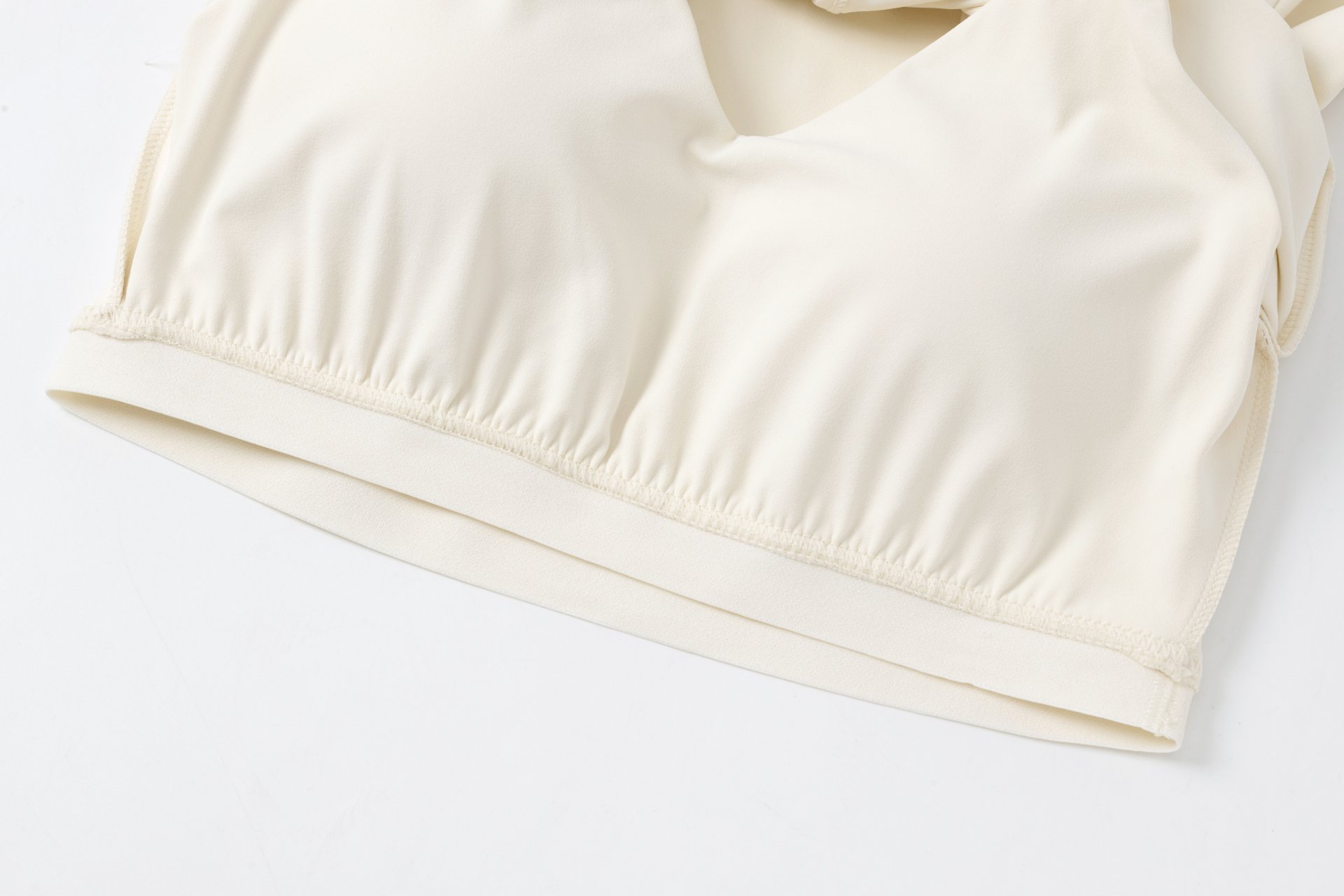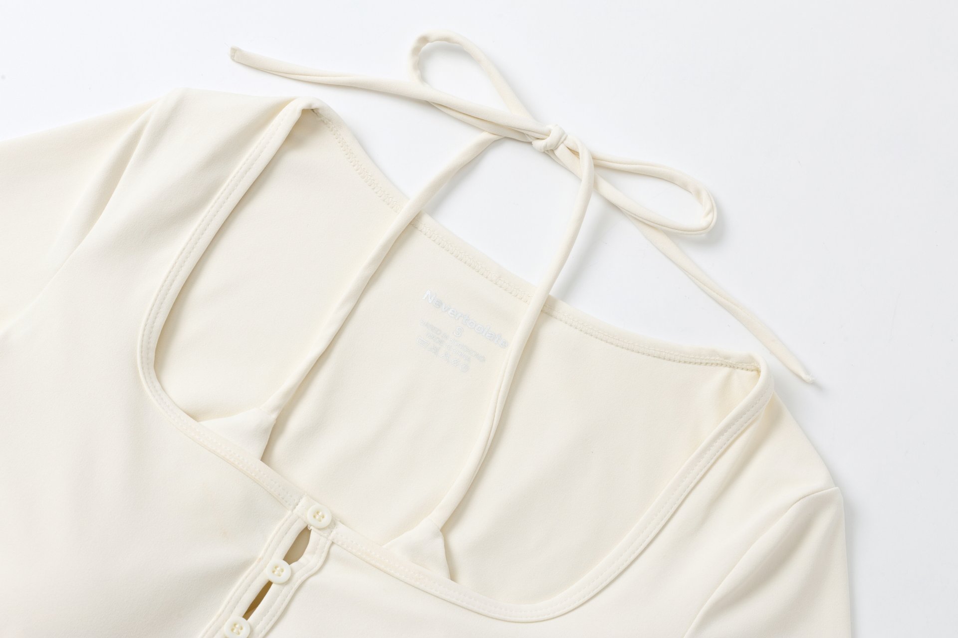 半固定菱形杯:暗示這件上衣內部(或搭配的內衣)使用菱形設計的胸墊,提供一定的支撐和聚攏效果。