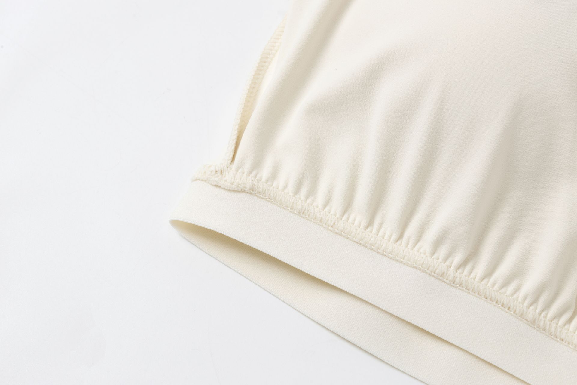 半固定菱形杯:暗示這件上衣內部(或搭配的內衣)使用菱形設計的胸墊,提供一定的支撐和聚攏效果。