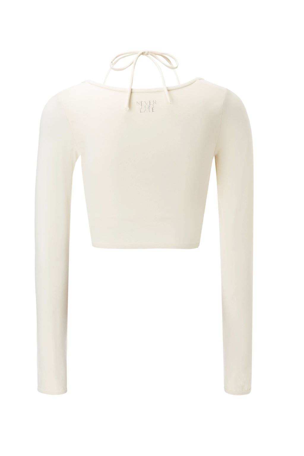 貓耳掛脖假兩件 (重要設計):這是一件長袖上衣和一件掛脖內衣(可能為運動文胸或吊帶)的組合。