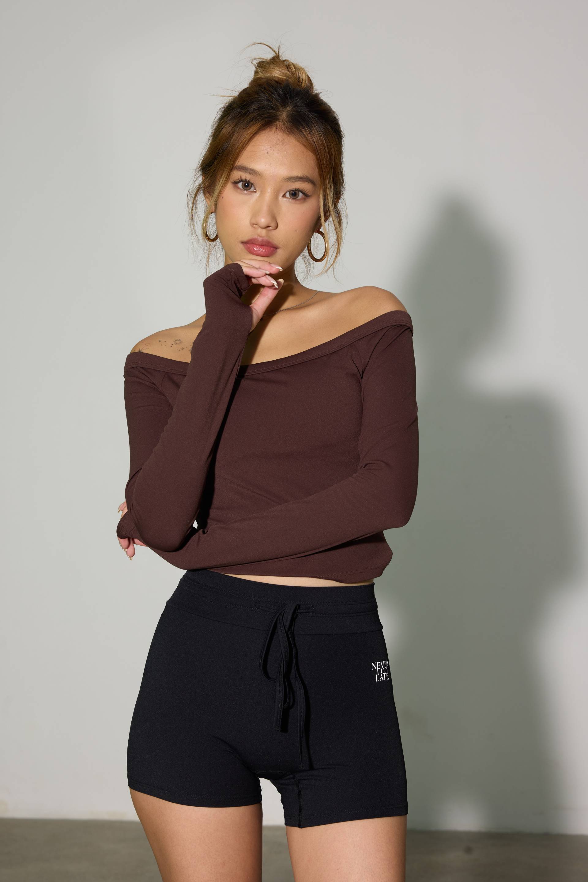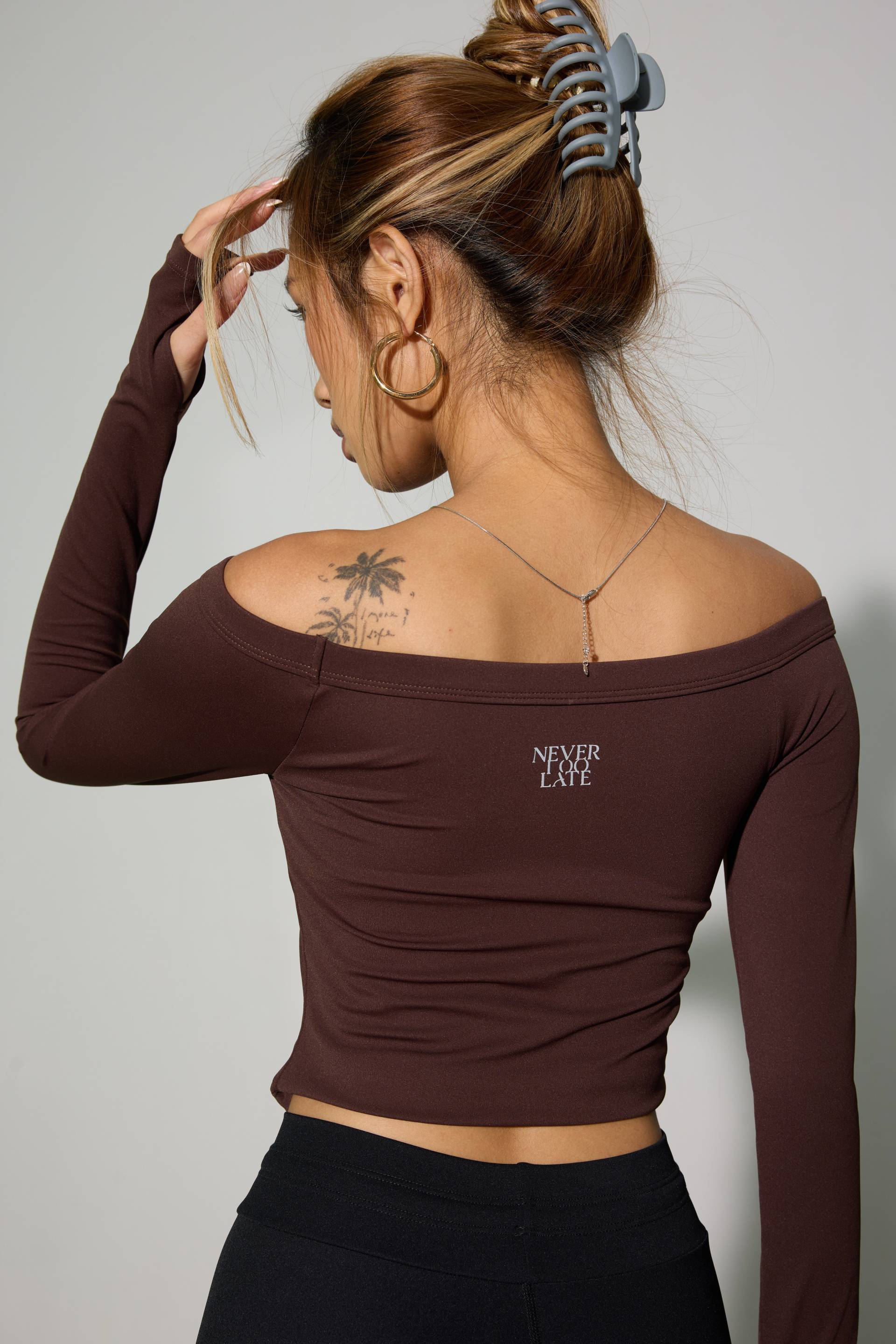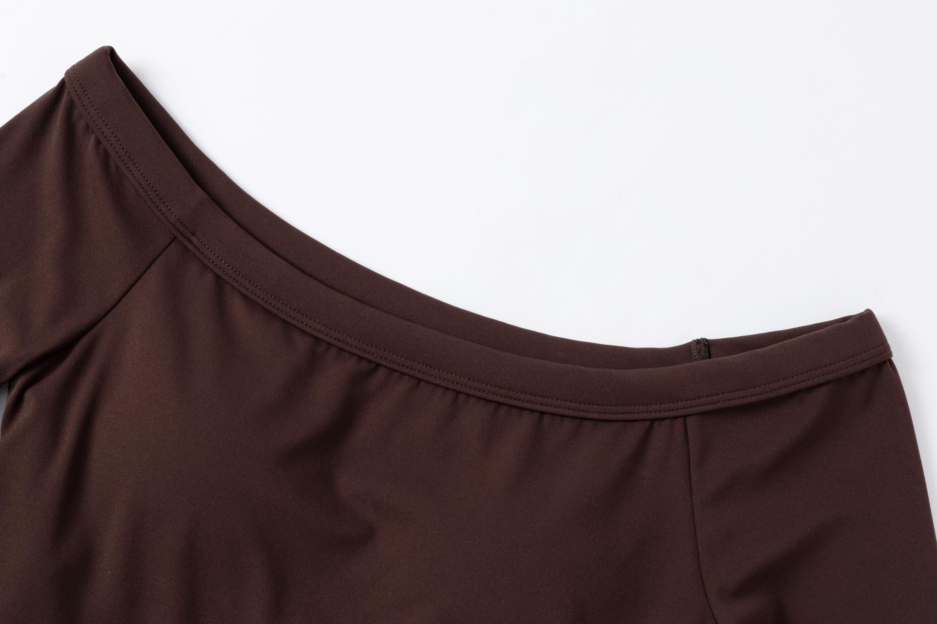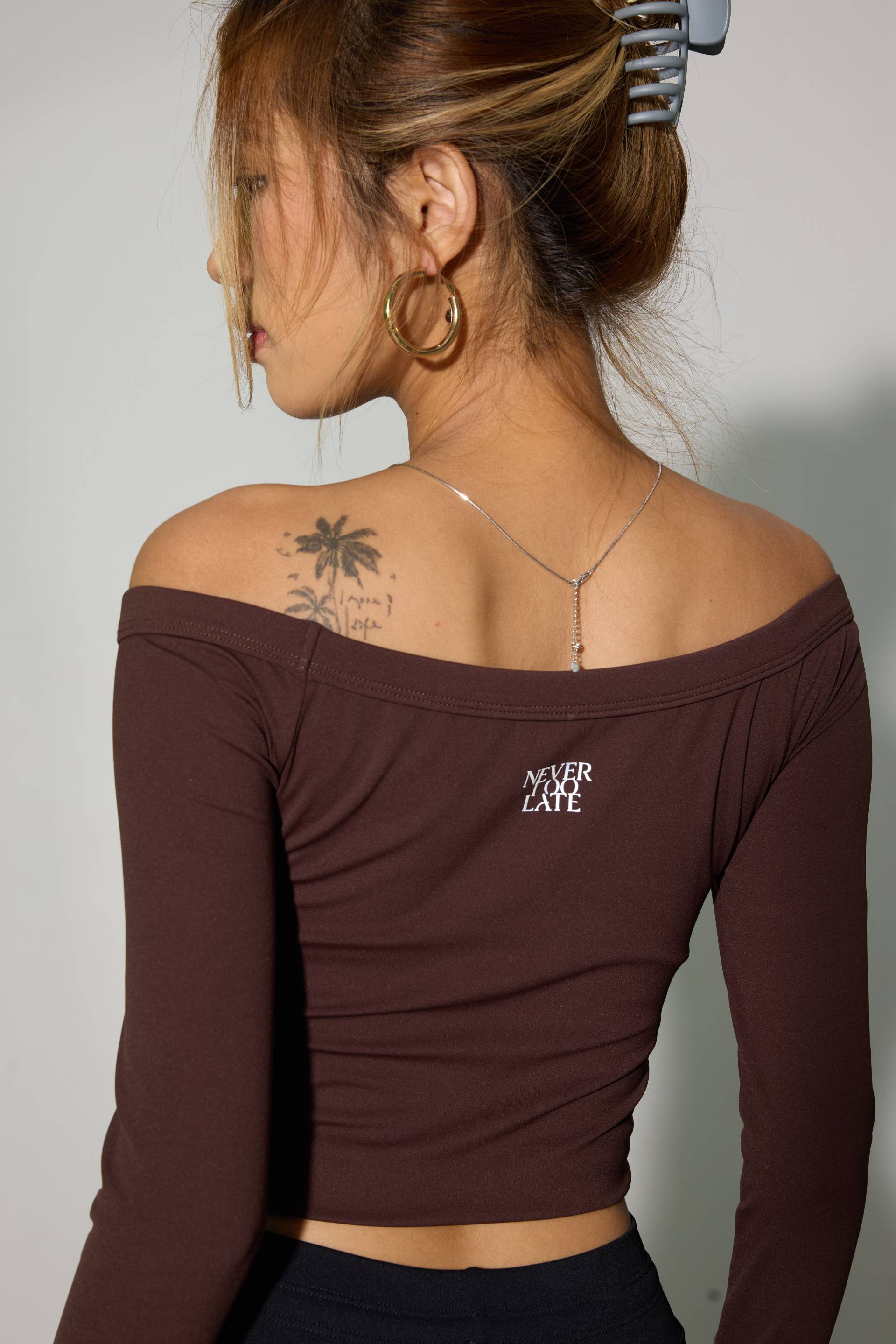NVTT518- 深咖啡一字肩貼身多造型運動上衣(連胸墊)