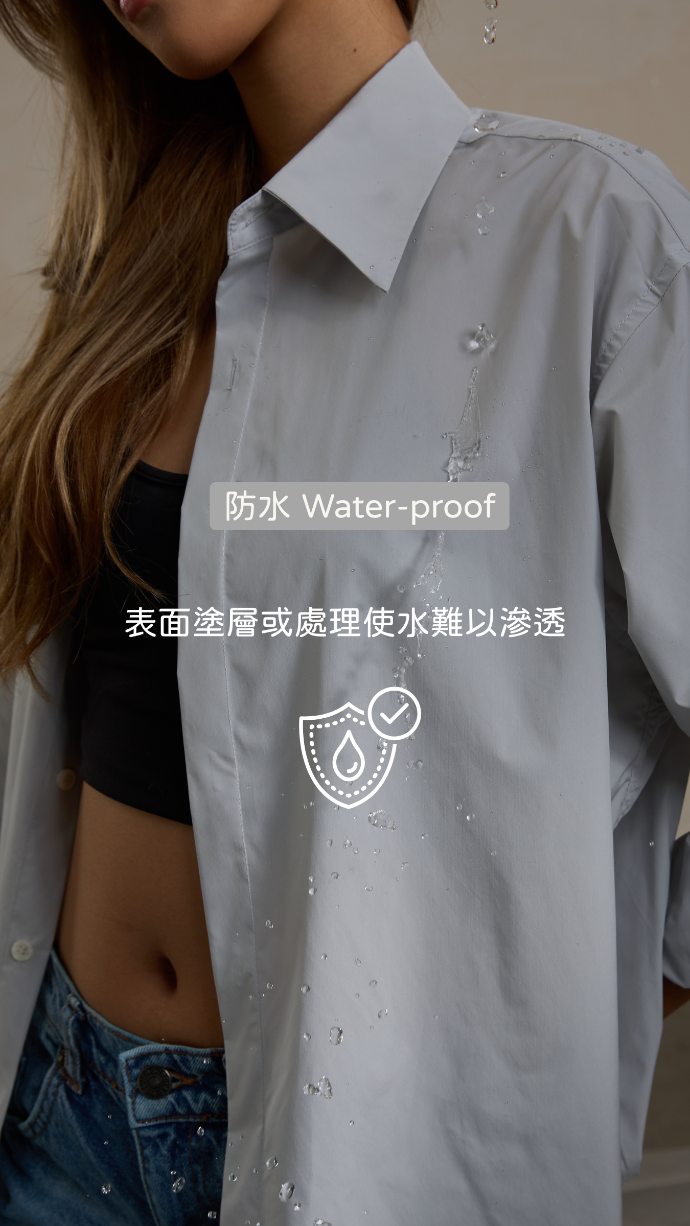 防水 (Water-proof/Water-repellent): 表面塗層或處理使水難以滲透。