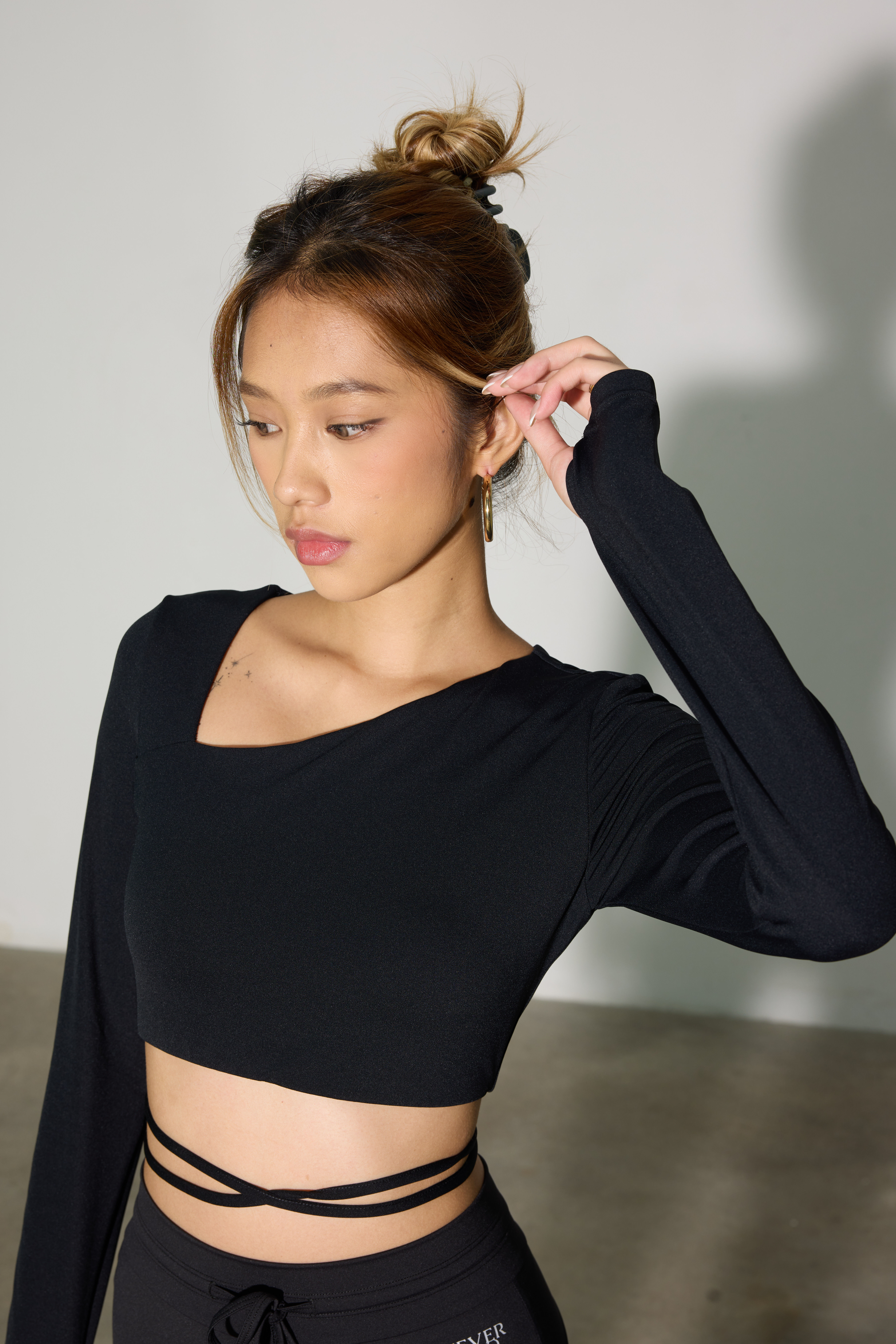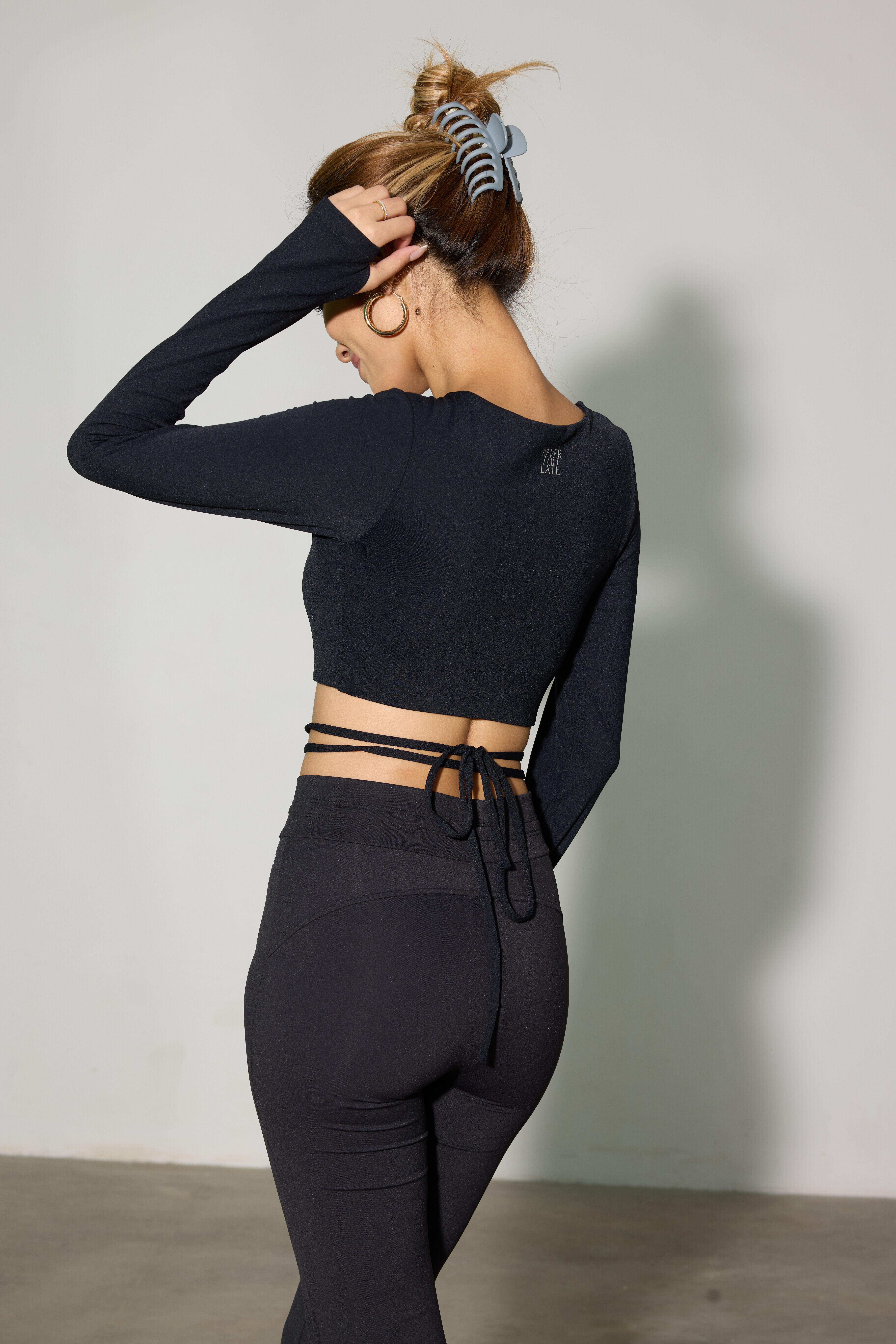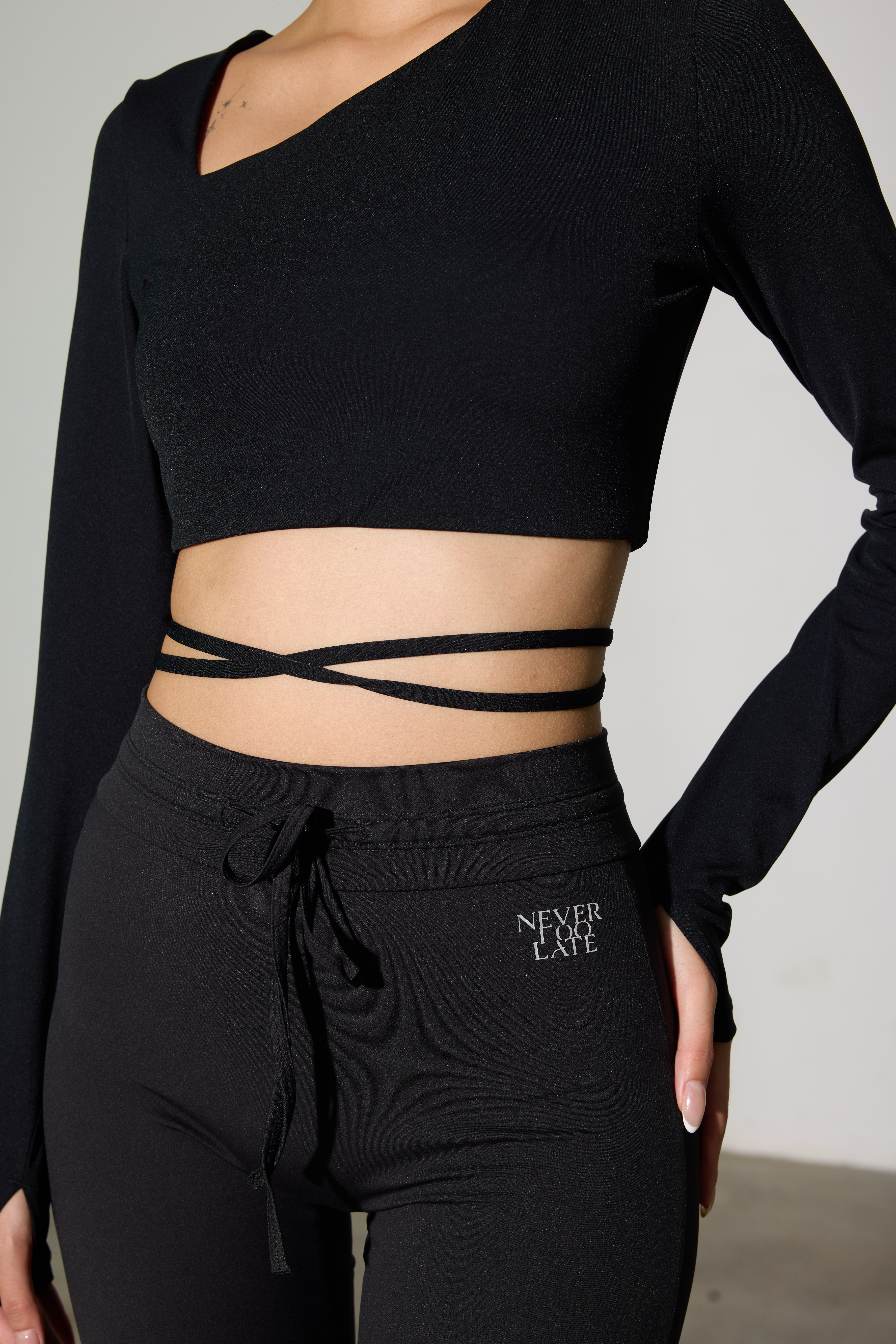 隨搭細綁帶:上衣下擺設計有兩條細長綁帶,可以繞過腰腹部進行交叉纏繞。